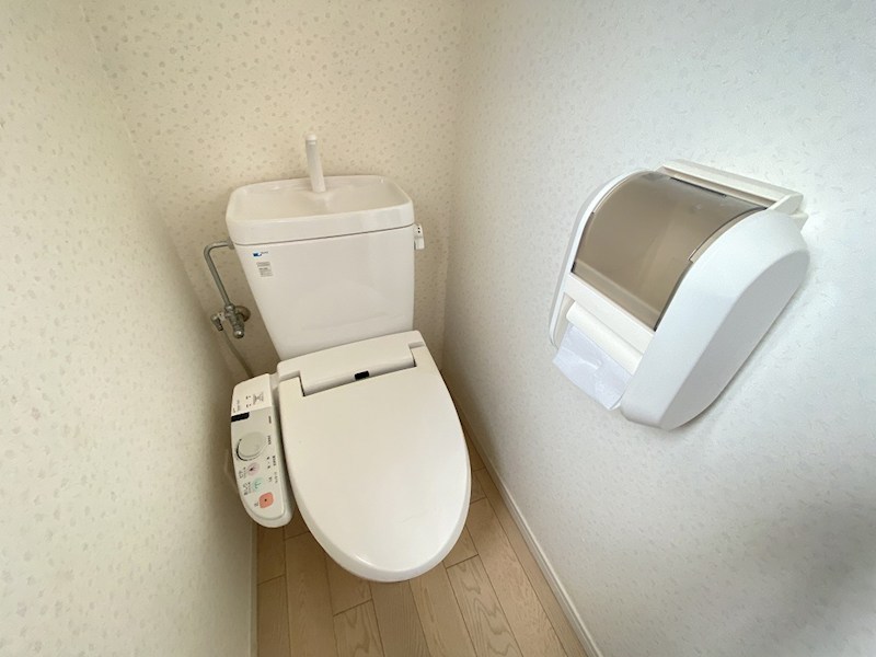 カウンター、手洗い付きのトイレです。トイレットペーパーや掃除道具など収納できます。