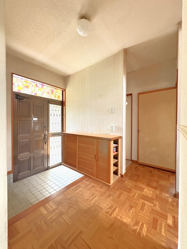シューズボックス付きの玄関です。レトロなステンドグラスがきれいです。