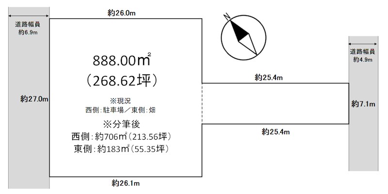 - 西6.9m公道 間口27m / 東4.9m公道 間口7.1m