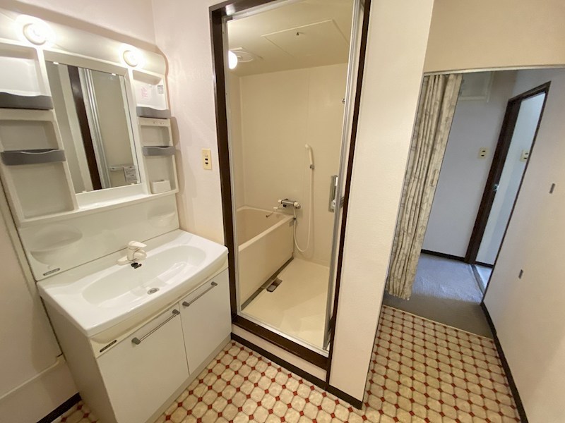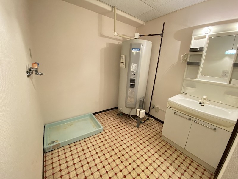 レトロな柄のクッションフロア。ゆとりある洗面所です。