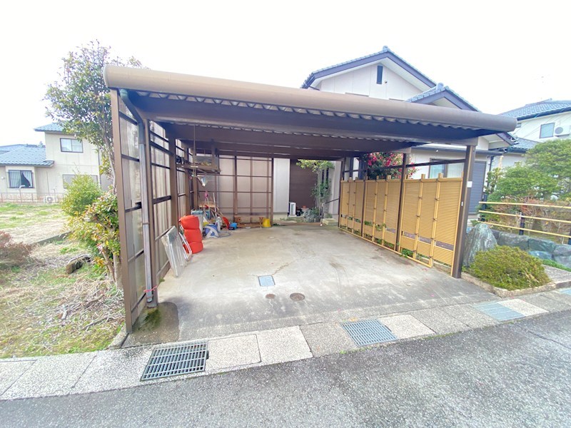 納戸付きで収納スペースも充実しています。駐車スペースは屋根付きで並列2台可能。