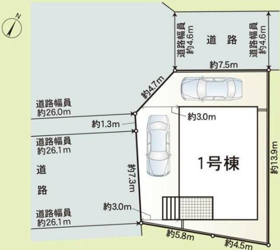 - 北西4.6m公道 間口7.5m / 南西26m公道 間口8.7m