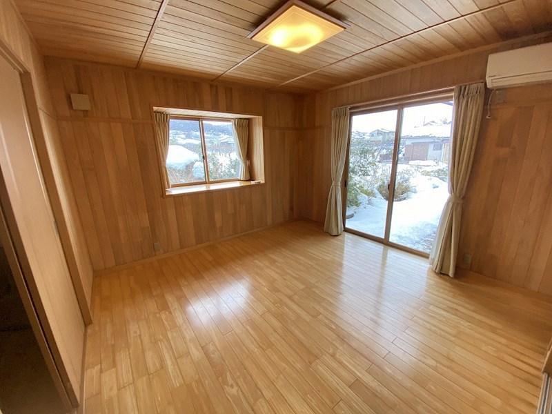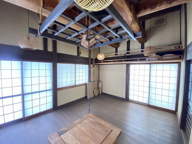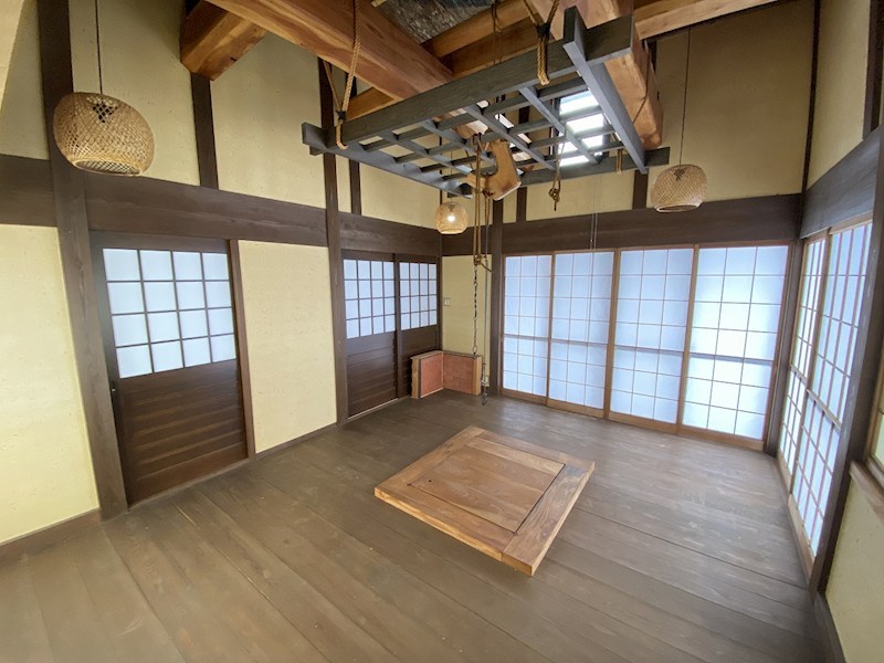 離れの洋室には囲炉裏があります。板張りの床も趣がありますね♪