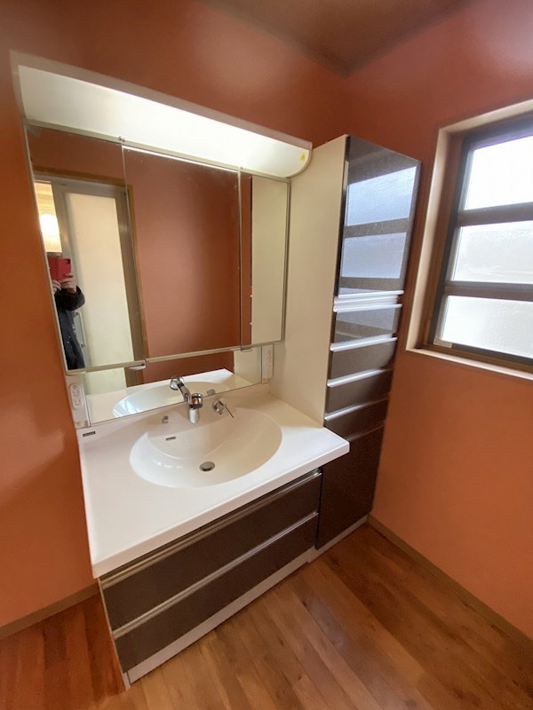 洗面台横の収納に細かい化粧品やドライヤー・タオルなど収納できます。