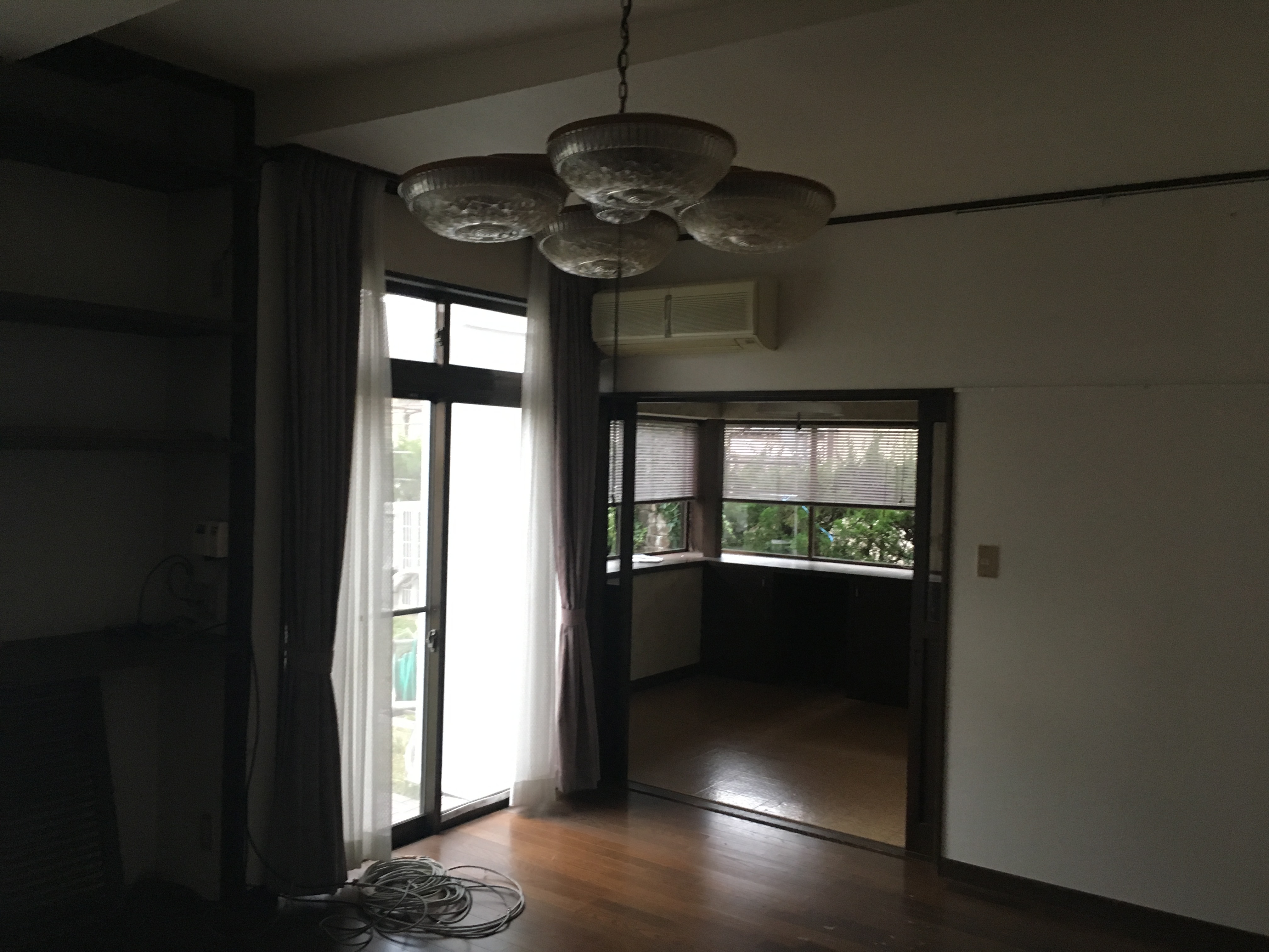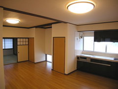 天井・壁クロス貼替 床フロアタイル貼 照明器具取替 木部塗装 敷居撤去 システムキッチン新設 ガスコンロ新設 TV端子新設 エアコンコンセント新設 フラッシュドア新設